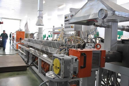 Технология изготовления изделий из дпк называется экструзия. Технология очень сложная, а если «на пальцах» это как большая мясорубка, в которую насыпаются необходимые компоненты, перемешиваются и под давлением выходит нужный профиль изделия. Процентное соотношение компонентов следующее: 70% — натуральная древесина, 24% — полиэтилен и 6% – это красящие и функциональные добавки высокой светостойкости, которые и обеспечивают долговечность.